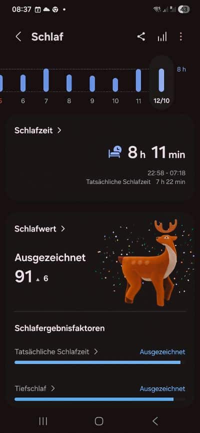 Aber dass es auch ein Schlaf-Coaching gibt? Gerade erst entdeckt. Ich habe dabei gleich mal meinen Schlaftyp analysieren lassen: Ich bin ein Hirsch. Das bedeutet laut Samsung Health: „Hirsche sind scheue Tiere, die fliehen, wenn sie sich bedroht fühlen. Hirschschläfer schlafen in regelmäßigen Abständen, neigen aber im Schlaf dazu, sich hin- und herzuwälzen oder aufzuwachen und schlafen nicht lange genug.“