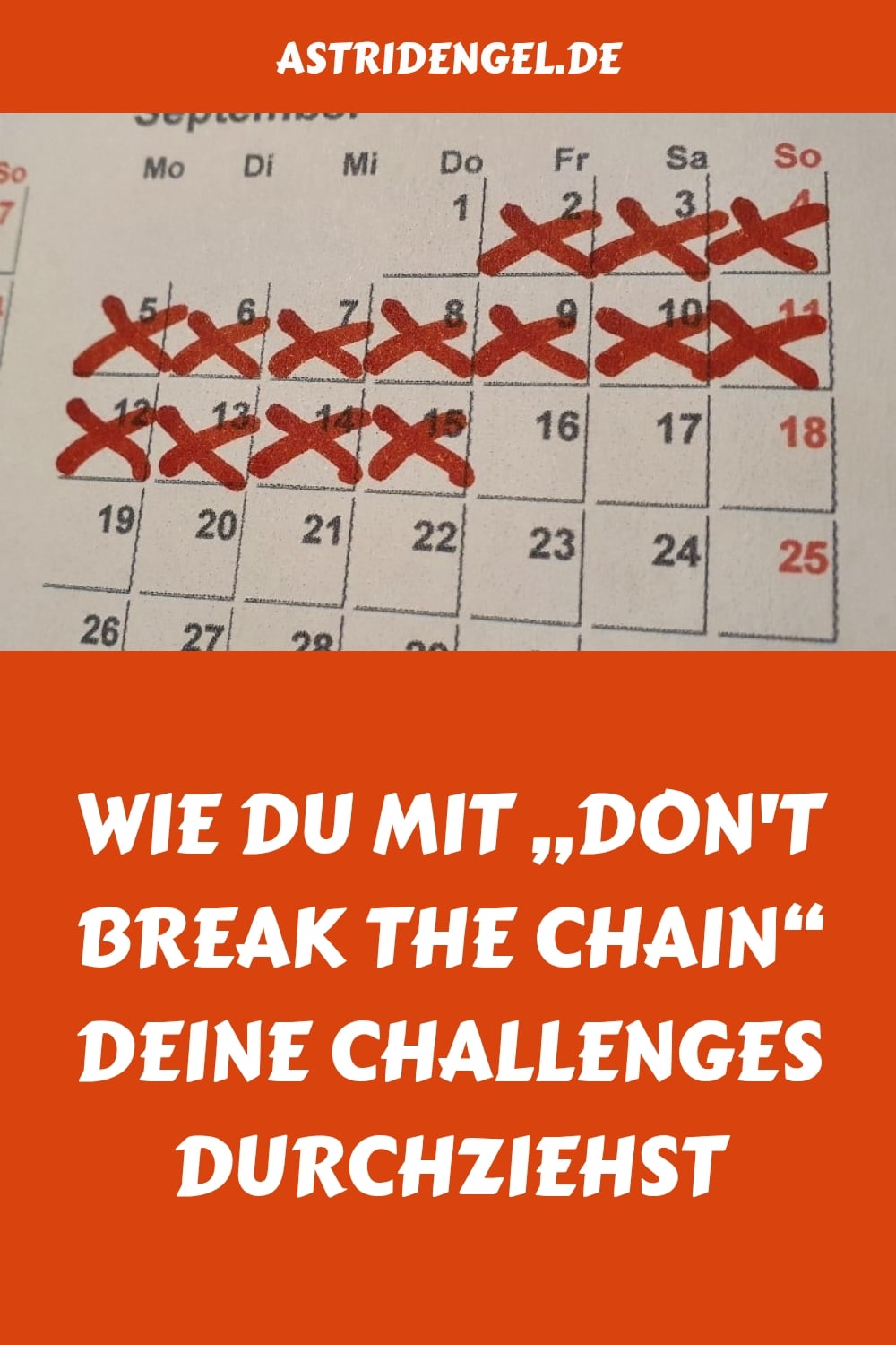 Das Prinzip von „Don’t break the chain“ – unterbrich die Kette nicht – ist simpel: Du nimmst dir vor, täglich etwas Bestimmtes zu machen oder zu unterlassen. Hast du deine Aufgabe erfüllst, kreuzt du den Tag im Kalender mit einem roten Textmarker an. Durch die aufeinanderfolgenden oder aneinandergereihten Kreuze entsteht eine Kette.
